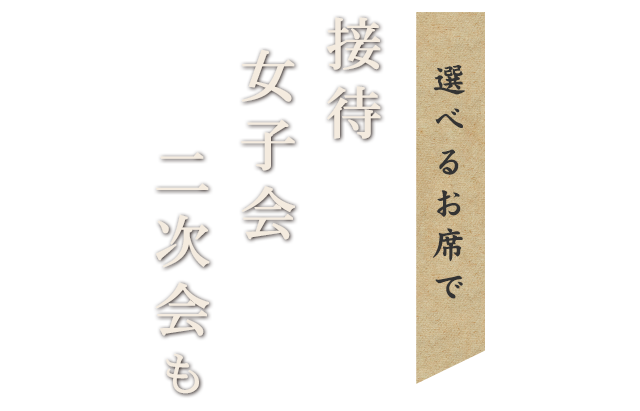 1階はカウンターとテーブル席、2階には掘りごたつと畳の個室などを持つ当店は、お客様の人数やお使いのシーンに合わせてご自由にお部屋を選んでいただけます。大切な接待や話が弾む女子会、飲み会の二次会など催しに合わせてお気軽にご相談ください。